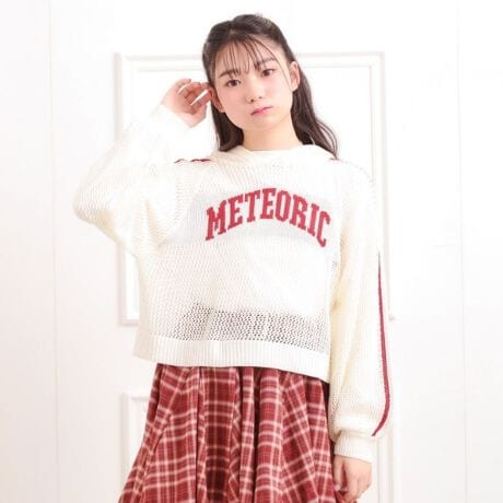 フロントはナンバリングとカレッジ風ロゴのアソートデザインで、ニットはさらっとした素材なので春先まで使えます。