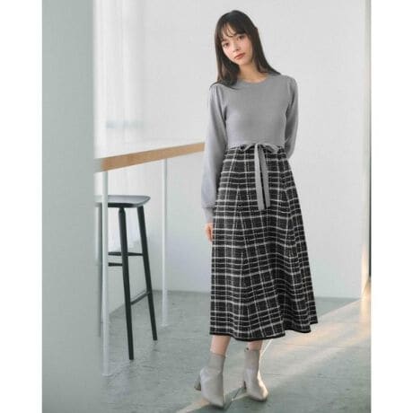 ・スカート部分のジャカード素材は、表情のある立体的な編地が上品感を引き出し、1枚でコーディネートが完成する特別な仕上がりに。