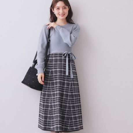 ・スカート部分のジャカード素材は、表情のある立体的な編地が上品感を引き出し、1枚でコーディネートが完成する特別な仕上がりに。