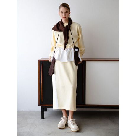 トップスの裾には布帛のパーツがドッキングされており、着用すると1枚でスウェットとシャツをレイヤードしたようなデザインに。