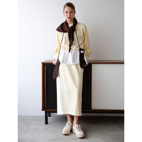トップスの裾には布帛のパーツがドッキングされており、着用すると1枚でスウェットとシャツをレイヤードしたようなデザインに。