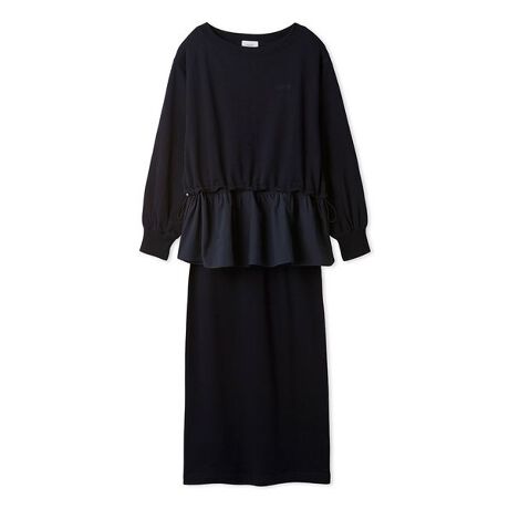 トップスの裾には布帛のパーツがドッキングされており、着用すると1枚でスウェットとシャツをレイヤードしたようなデザインに。