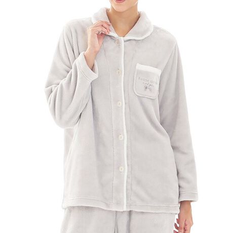 [型番:25-82401]ナルエーで人気のもこもこ素材「スノーパウダー」ふわふわと柔らかく、全身を包み込むようなあたたかさが魅力です。マシュマロのようなタッチで、思わず頬ずりしたくなるほどのなめらかさ。シンプルで使いやすい前開きのシャツタイプのパジャマ。襟周り、前立て、ポケット部分をバイカラーで仕上げました。胸ポケットにはロゴ刺繍と、小さなリボンのワンポイント。シンプルな中にも、ちょっとした可愛らしさと遊び心を忘れない、ナルエーらしいデザインです。