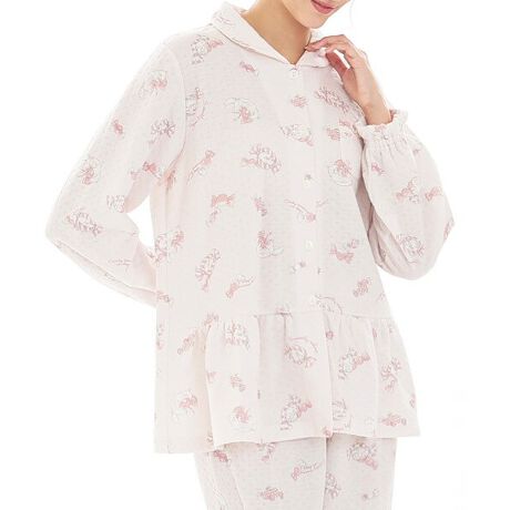 愛らしい猫とキャンディのプリントに、ふんわりと広がる大人かわいいパジャマ。