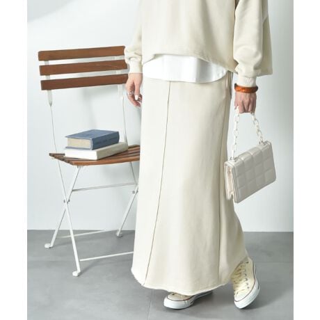 まだまだ寒い時期に活躍する裏起毛素材を使用しました。優しい肌さわりで華奢見えするシルエットのナロースカートです。少し高めの位置に付いたアウトポケットとロゴがスタイルアップのポイントです。また、切りっぱなしのディテイールでこなれ感もプラス◎長めの着丈で旬な大人カジュアルスタイルに決まります。