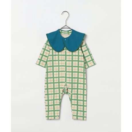 春らしい総柄デザインの前あきカバーオールと、