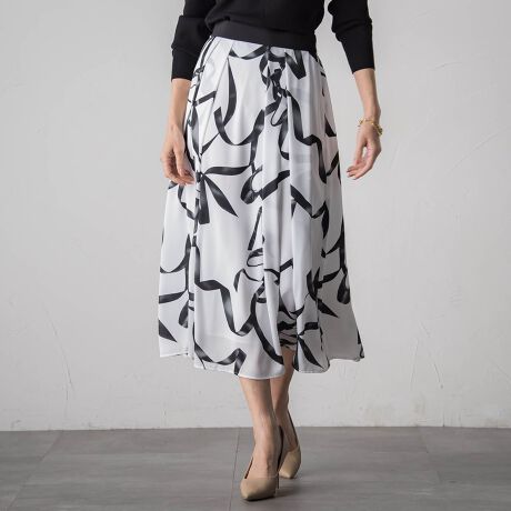 裾に向かってふんわり広がる美しいシルエットが女性らしさを引き立て、バックウエストはゴム仕様で快適な履き心地を実現。