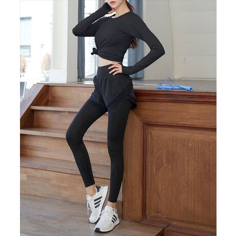 動かしやすく体型カバーもできる、トップスとショートパンツ一体型レギンスの2点セット。