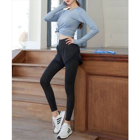 動かしやすく体型カバーもできる、トップスとショートパンツ一体型レギンスの2点セット。