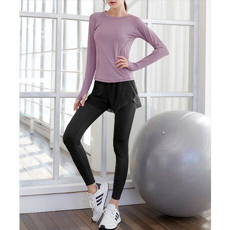 動かしやすく体型カバーもできる、トップスとショートパンツ一体型レギンスの2点セット。