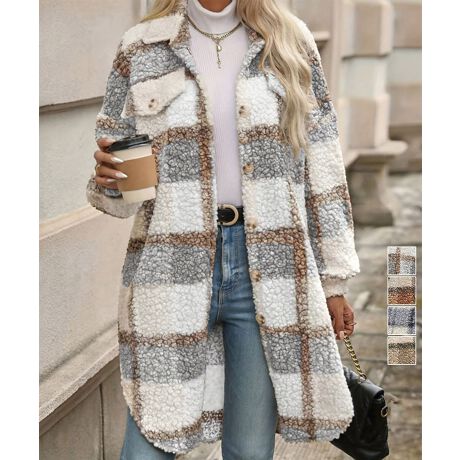 チェック柄のもこもこボアが目を引くロングシャツジャケット。