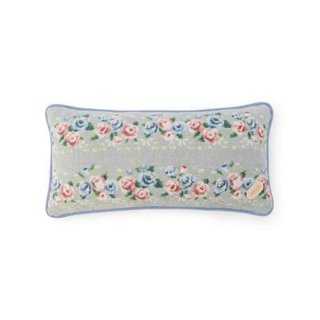 前面には柄、背面は無地にしてメリハリを効かせた『ノスタルジックノート』の横長クッション。ピンクやブルーで彩られた花々が、空間を一気に明るくしてくれそう。肘や足などを乗せたり、お昼寝用の枕としてもお使いいただけます。ご自宅でのリラックス空間を演出する、インテリアのアクセントとしていかがでしょうか。