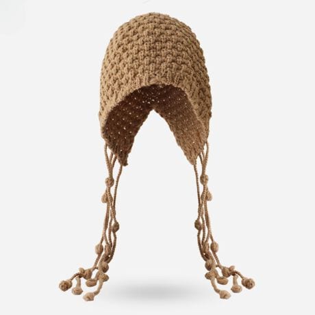 -長めのポンポン紐が可愛いざっくり編みニット帽