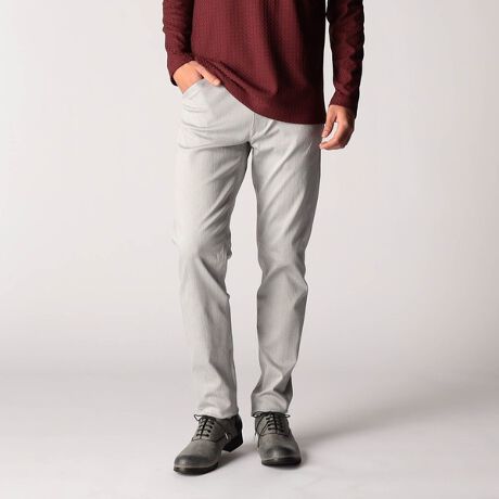 ウエストと腰周りは少しタイトめ調整、膝から裾口にかけて少しゆとりを出した程良いスリムストレートシルエットの細身の綺麗なラインです。股下はフルレングスなので裾上げして調整してください。