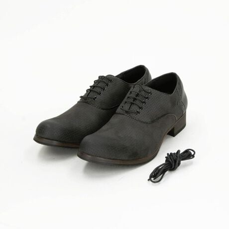 内羽根(オックスフォード/バルモラル)デザインのプレーントゥシューズ。トゥスプリングの効いたシャープなシルエットで少し細長いの綺麗なラスト(木型)を採用。丸ゴムタイプのシューレースに、シュータンと履き口にクッション材を入れる事で足入れした時のFIT感を高めています。牛革のヒールカウンターや配色のパイピングを入れて細部にまでこだわっています。ナチュラルなウッド調ソールに滑り止めを貼りました。今季はインソールのクッション性を上げ、ソールのコバの張り出しを中止してスマートなシルエットに作っています。シューレースは従来の伸びないタイプも付けていますので好みに合わせて変えられます。最終仕上げで手作業によるアンティーク加工を施して高級感のある仕上がりにしてます。