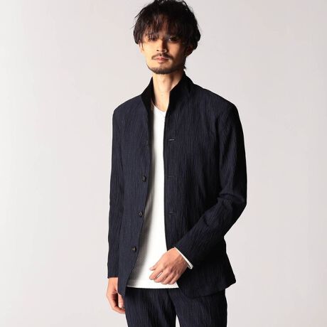 定番スタンドデザインのカヴァーオールジャケット。衿端にワイヤーを入れています。ねかしてラペルにしても収まる設定にしていますので、Vゾーンを綺麗に作れます。一重仕様の軽い仕上がりでシャツ感覚で着用出来ます。前身裏のみ付け、内ポケットを作っています。フロントの一番下の釦は止める設定していませんのでご注意ください。