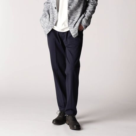 イージーパンツ仕様のスラックスデザイン。折り山プレスを入れてドレカジライクに仕上げています。ベルト裏にはジャカード裏地をアクセントに使用、内側の袋布などストレッチ裏地を使う事で、表地に追従するストレスフリーな穿き心地、清涼感を高めています。右後ろにモバイルポケットを設け、ロゴ入り釦やオリジナルDカンを採用して差別化を図っています。