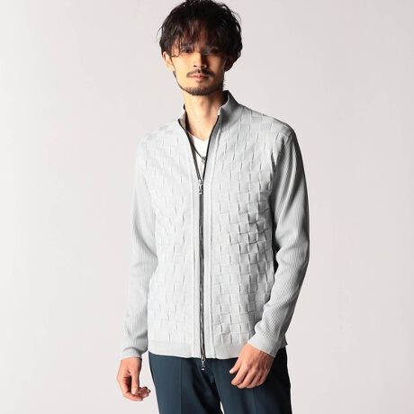 身頃をシャープなブロック柄に編み立てたフルジップタイプのスタンドニットブルゾン。細番手を使用したハイゲージの編地が柄の凹凸感を引き立てています。箔転写ファスナーをアクセントに、ラグジュアリーかつモードな印象に仕上げています。袖と細腹の編地はリブに切り替え、着用感を高めながらシャープなシルエットを演出。脇前の切替部分にはスラッシュポケットを設け、機能性もプラスしています。