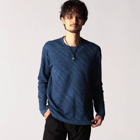 ゼブラ柄をスプレー風ボカシプリントで表現したクルーネックロンT。クラック系の接結ブリスタージャカードとマッチした艶感のある仕上がりです。