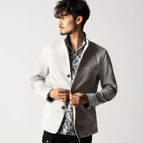 スタンド・イタリアンカラーのカヴァーオールジャケットと、ショートスタンドカラーのGジャンデザインのアラカルト展開。ジャケットは衿は折り返してもラペルとして綺麗に収まる設定、タブで釦止めが出来ます。フロントの一番下の釦は止める設定していませんのでご注意ください。Gジャンは今季新型、細身のシャープなシルエットと衿端にワイヤーを入れたショートスタンドカラーが特徴です。裏側に迷彩柄ジャカード裏地を使用してアクセントにしています。