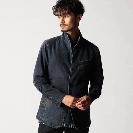スタンド・イタリアンカラーのカヴァーオールジャケットと、ショートスタンドカラーのGジャンデザインのアラカルト展開。ジャケットは衿は折り返してもラペルとして綺麗に収まる設定、タブで釦止めが出来ます。フロントの一番下の釦は止める設定していませんのでご注意ください。Gジャンは今季新型、細身のシャープなシルエットと衿端にワイヤーを入れたショートスタンドカラーが特徴です。裏側に迷彩柄ジャカード裏地を使用してアクセントにしています。