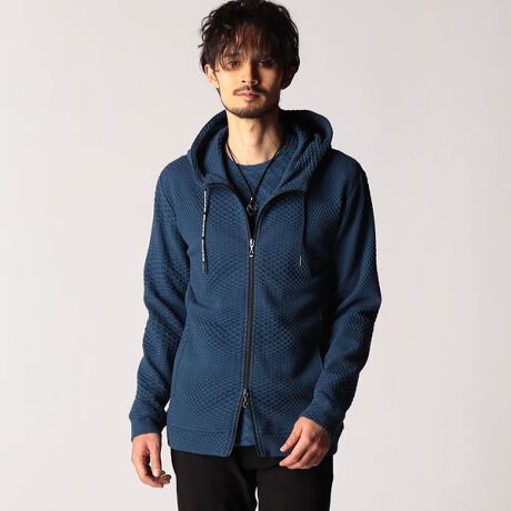 インパクトの強い幾何学柄を無地とモノト−ンで表現する事で大人綺麗目なモ−ドテイストに仕上げています。切替を生かしたシームポケット、ブランドロゴを繊細にプリントしたスピンドルがデザインポイントのフルZIPフーデッドパーカ。冬はコートの下に着用しても着ぶくれせず、春先にはTシャツの上に羽織るのに丁度よい肉厚感とサイズ感に仕上げました。