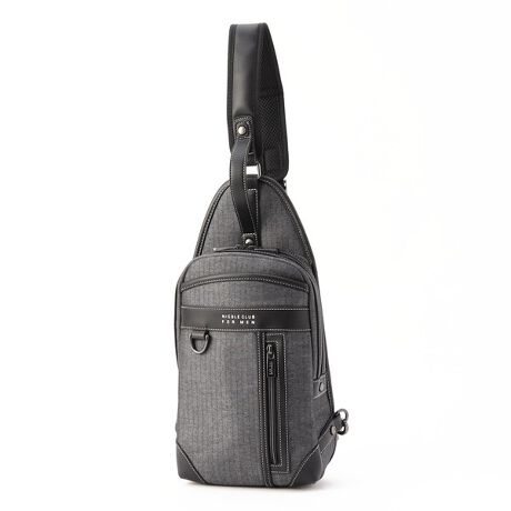 光沢感のある地柄素材と合皮の別生地切り替えがスタイリッシュな印象のきれいめボディバッグ。箔押しロゴをアクセントに、フロントのあおりポケット仕様やショルダーベルトには別生地のハンドルを設けて使い勝手も申し分ないです。今季はフロントにDカンをあしらいデザインアップデート。ストラップやキーホルダーの取り付けも可能です。