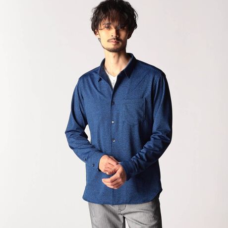 ショートレギュラーカラ−のジャージ素材シャツ。羽根衿裏やカフス裏など裏地を採用して軽量化を図っています。台衿と身返しを一体型にしたオリジナルパターンで、ネクタイも出来るタイスペースを作りながら、Vゾーンはオープンカラーの様な見え方をする変わりデザインです。その衿先にはワイヤーも入れていますので、衿を立てても格好良く着れます。