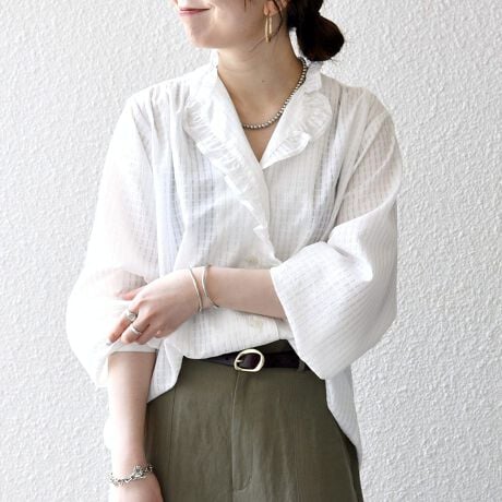 フェミニンなフリルデザインなので、デニムやチノパンなどカジュアルボトムと合わせるのがおすすめ。