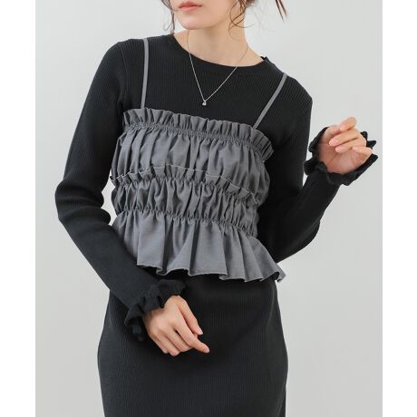 一枚でレイヤードスタイルが完成する、ビスチェ付きニットワンピース。すとんと落ちるニットワンピースに、立体感のあるビスチェを重ねることで、自然とメリハリのあるシルエットに仕上がります。袖のフリルやビスチェの甘さもありながらガーリーさはしっかり抑えたデザインで、大人の女性にも取り入れやすい一着。それぞれ単品使いもでき、着回し力の高さも魅力です。