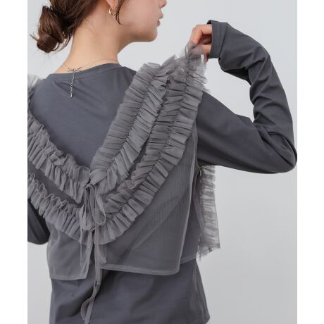 繊細なチュールフリルが目を惹く、前後2WAY仕様のベストとベーシックカットソーのセットアイテム。ふんわりと重なるフリルが顔まわりをやさしく彩り、シンプルなカットソーに重ねるだけで程よく華やかな印象に。ベストは前後どちらでも着用でき、リボンの結び方次第で表情を変えられるのも魅力です。甘さの中に抜け感をプラスした、大人のレイヤードスタイルが完成します。