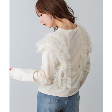 繊細なチュールフリルが目を惹く、前後2WAY仕様のベストとベーシックカットソーのセットアイテム。ふんわりと重なるフリルが顔まわりをやさしく彩り、シンプルなカットソーに重ねるだけで程よく華やかな印象に。ベストは前後どちらでも着用でき、リボンの結び方次第で表情を変えられるのも魅力です。甘さの中に抜け感をプラスした、大人のレイヤードスタイルが完成します。