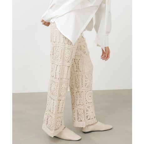 パンツ全体がクロシェ編みになったシーズンムードの高まるアイテム。ウエストはゴム仕様になっているのでノンストレスな着心地。ストレッチ性の高い裏地で動きやすさもあり、デザイン性と可動性を両立させた1枚。シンプルなコーディネートがお好きな方にも挑戦しやすいベーシックカラーでの色展開になっています。