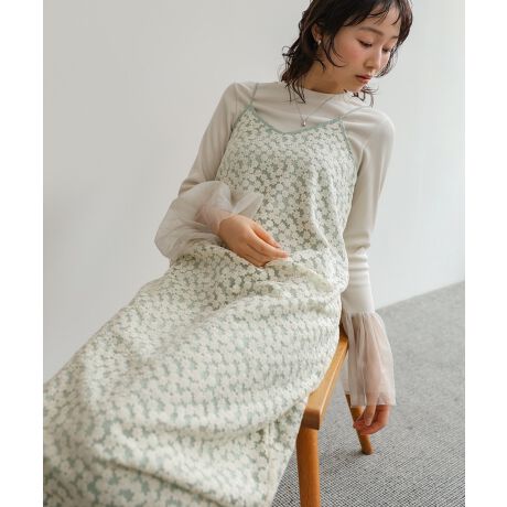 全面に繊細な花柄刺繍をあしらい、まるで花畑に包まれているかのような華やかさが魅力のキャミワンピースです。甘さを抑えた上品な刺繍デザインで、大人フェミニンな印象に仕上げました。バックスタイルにはリボン仕様のレースアップデザインを取り入れ、後ろ姿まで抜かりなく可愛さを演出。肩紐は調整可能なので、身長やスタイリングに合わせてバランス良く着用いただけます。