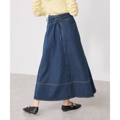後ろ姿までもかわいいフレアシルエットデニムスカート。梅春の時期にまだ寒いけど冬のスタイリングに飽きたお客様にぴったりの万能デニムアイテムです。