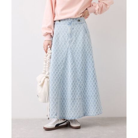 後ろ姿までもかわいいフレアシルエットデニムスカート。梅春の時期にまだ寒いけど冬のスタイリングに飽きたお客様にぴったりの万能デニムアイテムです。