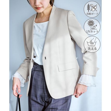 UVカット・花粉ガードの機能素材を搭載したノーラペルジャケット。