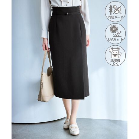 ・左サイド寄せのフロントタックで巻きスカート風のデザインを演出。フォーマルにもデイリーにも合わせやすいミディ丈。