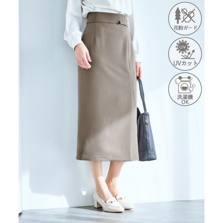 ・左サイド寄せのフロントタックで巻きスカート風のデザインを演出。フォーマルにもデイリーにも合わせやすいミディ丈。