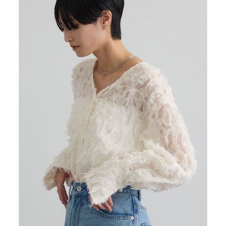 フリンジの表情と透け感が奥行きのある見え方を作り、シンプルなボトムにも映える素材感。