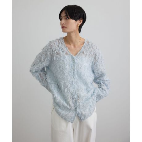 フリンジの表情と透け感が奥行きのある見え方を作り、シンプルなボトムにも映える素材感。