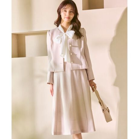 特別な日を華やかに彩る、パールボタンが印象的なセットアップ。ジャケットはウエストをすっきり見せるペプラムシルエットで、大粒のパールボタンが顔まわりを明るく引き立てます。やや短めの着丈でバランスが取りやすく、女性らしいメリハリを演出。スカートは6枚ハギのフレアラインが美しく広がり、動くたびに品のある揺れ感を楽しめます。