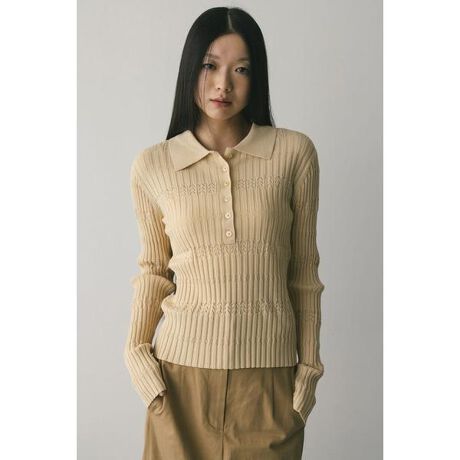 BEG:モデル身長172cm(FREEサイズ着用)NVY,MINT:モデル身長168cm(FREEサイズ着用)アイレット編みのリブが可愛いニットポロ。すっきりとしたリブの縦ラインがシルエットをきれいに見せつつ、アイレットの抜け感が軽やかな印象に導きます。クラシックなポロデザインにニットの柔らかさを掛け合わせ、きれいめからカジュアルまで幅広いスタイリングが可能。ジャケットインやハイウエストボトムとの相性も良く、シーズンを通して着回せるアイテムです。ストレッチあり、透け感あり(アイレット部分)。【お手入れ方法】手洗い可