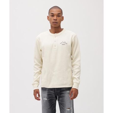 ・ヘンリーネック長袖Tシャツ・独特のおうとつ感と柔らかい肌触りが特徴なハニカムワッフル素材を使用・左胸には、オリジナルロゴをプリント・背中には、シンプルなステンシルをプリント・少しタイトなシルエット・3色展開【AVIREX/アヴィレックス】1975年にアメリカ空軍のコントラクターとして創業し、フライトジャケットを供給した事でその認知度を飛躍的に高めた。ミリタリーに起源を持つアヴィレックスは、機能的なデザインが醸し出す特有の美しさに支えられている。その個性的な表情は、映画「インディー・ジョーンズ」「トップガン」「メンフィスベル」などのスクリーンでも活躍し、喝采を浴びた。その無駄の無いデザイン、ノスタルジックな味わいは今なお世界中の多くの人々から支持され続けている。■お使いのパソコンのモニターによって、実物商品とカラーが異なって 見える場合があります。誠に申し訳ございませんが、ご理解下さいます様お願いいたします。■当ショップの在庫数は 直営店舗の商品も含まれています。在庫数が日々変動する為、ご注文頂いた時点で在庫が完売になっている場合がございます。 ■サイズ表は、製品の生地や織りなどの特性により、多少の誤差はございます。予めご了承ください。■画像の商品はサンプルです。実際の商品では、仕様・加工等若干異なる場合がございます。