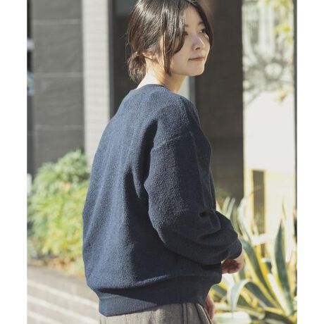 ポリエステルとナイロンの混紡糸でフワッとした軽さと戻りの良い弾力で型崩れしにくく着心地が良いのが特徴となっています。表面に小さなループを無数に立てたパイル編みと杢調のカラーで立体的な表情に仕上がっています。シンプルでカジュアル過ぎないアイテムですのでコーディネートしやすく、イージーケアですのでデイリーユースで活躍するニットになっています。