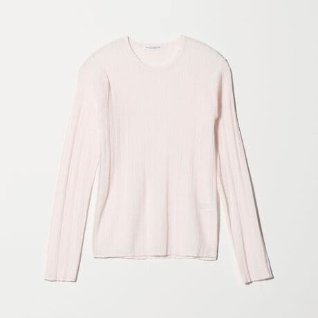 レーヨンポリエステルの細番手の糸をゆるく編み立てて、華奢さを引き立てたランダムリブニット。