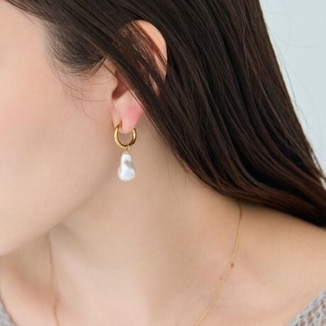【ゴールドのフープに、美しいニュアンスを宿すバロックパールを合わせたモードなステンレスイヤリング】