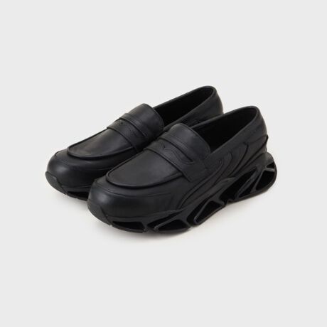 ミニマルでクリーンなアッパーに、未来的で構築的なボリュームソールを融合させたハイブリッドシューズ。