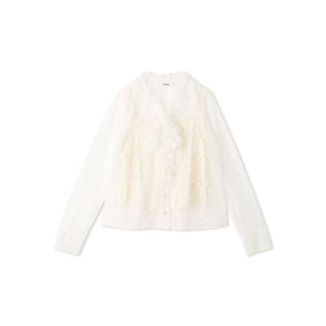 艶感とシボ感のあるオーガンジー、繊細な花柄のレース、デニム調薄手の生地の3素材並びでお作りした、定番人気のボウタイブラウスが届きました。今季は、ボウタイ部分を細やかで上品なフリルディテールに仕上げ、豪華でモードな仕上がりに。フロントのフリルリボンは固定されているので結ぶ必要がなく、一枚で可愛く着られるデザインです。ブローチ付きニットプルオーバー(SWNT261051)を上に重ねたレイヤードスタイルもオススメです。エレガントなツイードジャケット(SWFJ261033)の中に着てもクラシカルな着こなしが楽しめます。ブラウスには、アジャスタ付きのインナーキャミソールが付いています。