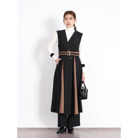 配色のコントラストが目を惹き、洗練された印象を与えるロングジレ。